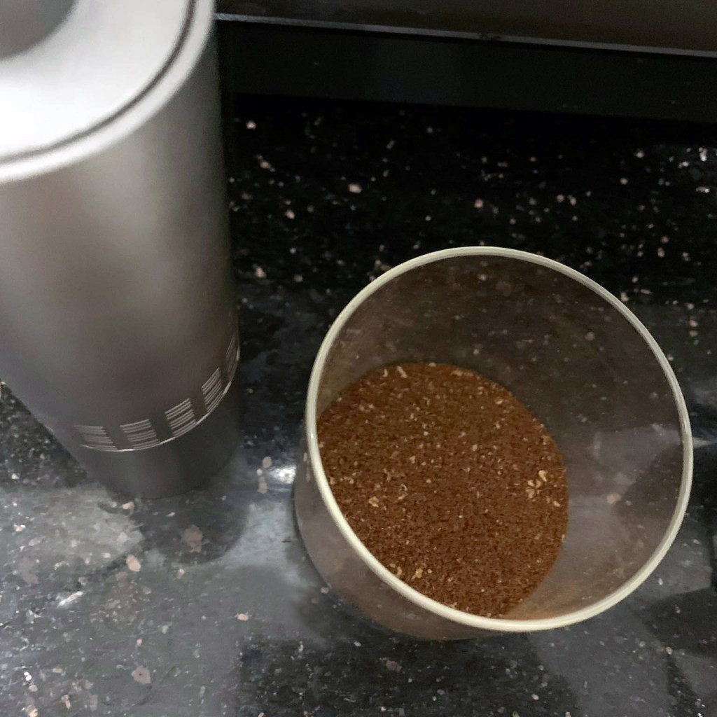 First, I grind about 18 grams of coffee beans. I am using Ethiopia Sidamo beans, light roasted. I know that the light roasted beans are specific for “filter brewing methods” like pour over. But, that the only choice I have now.